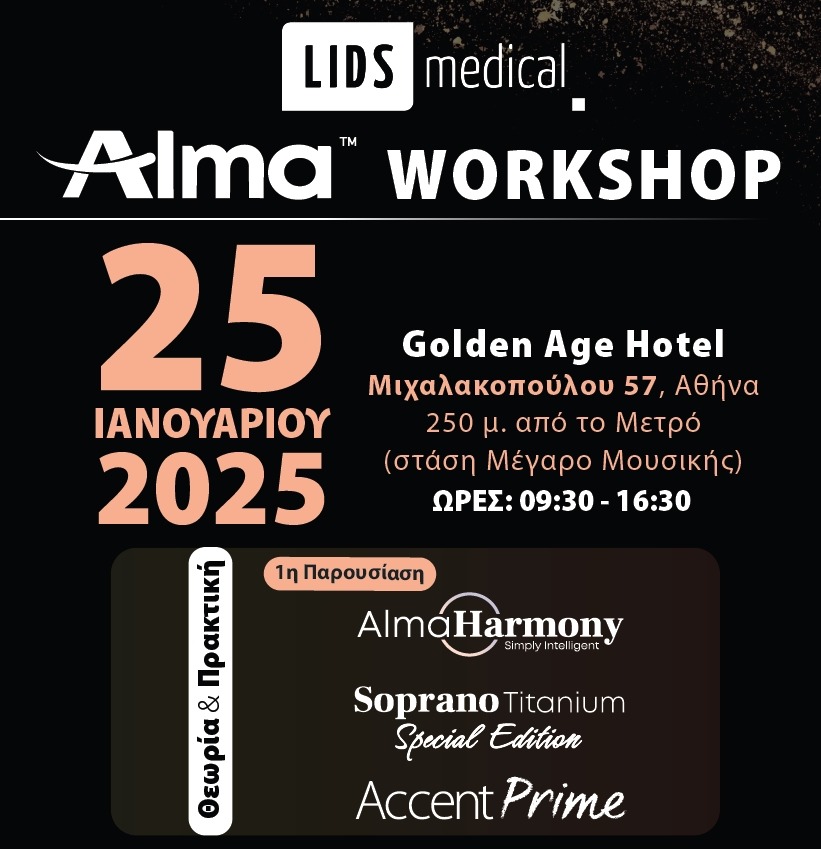 Θεωρία & Πρακτική από το Alma Workshop που διοργάνωσε η εταιρεία LIDS Medical στις 25/01/2025 για τη ΝΕΑ ΠΛΑΤΦΟΡΜΑ Πολλαπλών Δερματολογικών και Αισθητικών Εφαρμογών Alma Harmony, το ΝΕΟ ακόμη γρηγορότερο Soprano Titanium Special Edition και το Accent Prime.