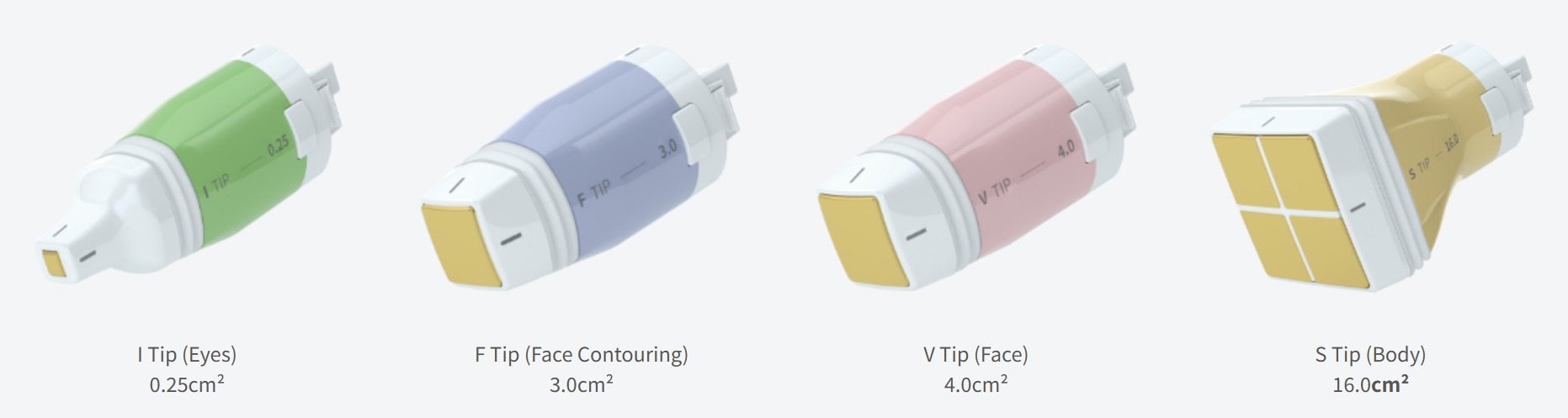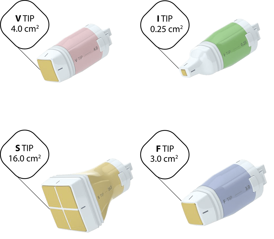 4 сменные уникальные картриджи с округлой поверхностью наконечника, разработанные для максимизации мощности RF и безопасности процедуры. Они также позволяют специалисту индивидуально настраивать лечение в соответствии с потребностями любого пациента.